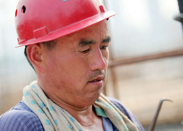 采訪時正值下午三點半,室外溫度達到35℃,再加上地面被太陽炙烤了幾個小時,直逼上來的熱氣讓人有點吃不消。筆者在工地的陰涼處呆了不到5分鐘,從頭到腳已出了不少汗。市房管局中遠公司涵翠苑項目部技術員陳生文告訴筆者,“項目部為工人們制訂了防暑降溫的辦法,充足供應綠豆水,正午太陽很毒的時候休息會,下涼后再干?!标惿恼f完,接個工友的電話就又忙著干活去了。