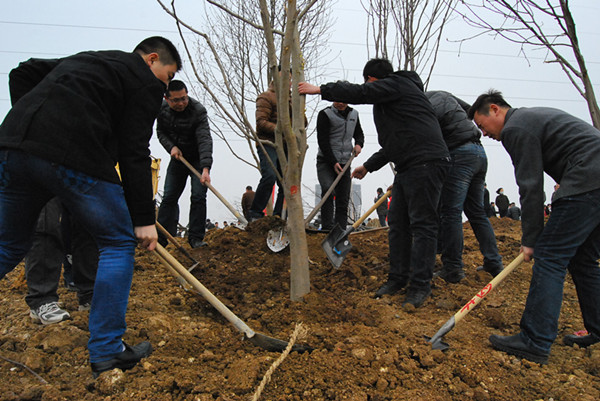 又到了一年植樹時(shí)節(jié),為積極響應(yīng)市委、市政府關(guān)于“創(chuàng)建全國(guó)綠化模范市”的工作目標(biāo),加快生態(tài)環(huán)境和宜居城市建設(shè)步伐,3月12日,公司職工們?cè)跁浂叛髨?jiān)的帶領(lǐng)下,參加了住建局組織的義務(wù)植樹活動(dòng)。 在北辛植物園現(xiàn)場(chǎng),彩旗飄揚(yáng),人聲鼎沸,現(xiàn)場(chǎng)呈現(xiàn)一派熱火朝天的勞動(dòng)景象。剛到現(xiàn)場(chǎng),筆者就看到職工三五人一組分頭干了起來,“一、二、三起”抬樹的男同志們喊著號(hào)子一齊發(fā)力,將土球直徑足有70公分的白玉蘭樹逐一抬進(jìn)樹坑,“刺啦一聲”有的同志竟因用力過猛將衣服撕出了一道長(zhǎng)口,雖如此,他們依然干勁十足,將每棵樹“安排到位”。樹一進(jìn)坑,女同志們就開始往坑內(nèi)填土,并將土踩實(shí),完成之后再澆上定根水,確保所栽樹木的成活率。合理分工、齊心協(xié)力,不到2小時(shí),現(xiàn)場(chǎng)區(qū)域內(nèi)的玉蘭、垂柳等樹就被栽種完畢。