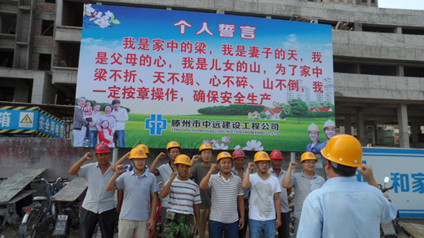 “我是家中的梁,我是妻子的天,我是父母的心,我是兒女的山……”這是中遠(yuǎn)公司和家園項(xiàng)目班前點(diǎn)名會結(jié)束后職工齊聲的宣誓。 該項(xiàng)目部負(fù)責(zé)人杜洋堅(jiān)書記告訴筆者,在班前教育活動中,加入這一形式,即在班前即將結(jié)束的2分鐘,組織職工集體學(xué)習(xí)、朗讀安全誓詞,已成為一種習(xí)慣。這一小小的環(huán)節(jié),不僅震撼了每一位職工的心,而且使“安全第一、生命至上”的理念入腦、入心、入耳,在宣傳中使職工的安全思想意識進(jìn)一步得到增強(qiáng)。